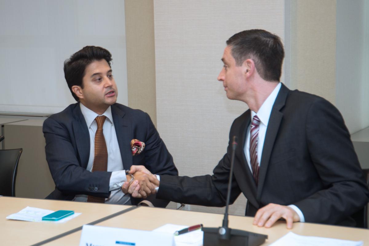 Minister Jyotiraditya M Scindia with Michael Greenstone of the Brookings Institution. (Photo: Embassy of India)